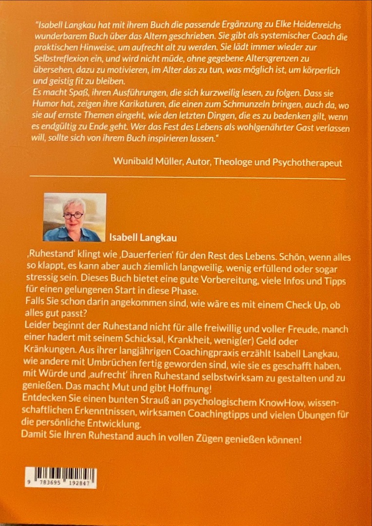 "Isabell Langkau hat mit ihrem Buch die passende Ergänzung zu Elke Heidenreichs wunderbarem Buch über das Altern geschrieben. Sie gibt als systemischer Coach die praktischen Hinweise, um aufrecht alt zu werden. Sie lädt immer wieder zur Selbstreflexion ein, und wird nicht müde, ohne gegebene Altersgrenzen zu übersehen, dazu zu motivieren, im Alter das zu tun, was möglich ist, um körperlich und geistig fit zu bleiben.