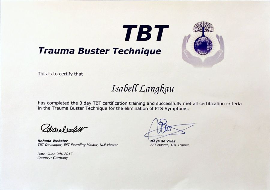 Bei meiner Ausbildung zum TBT-Practitioner im Juni 2017 lernte ich Rehana Webster, die TBT-Entwicklerin aus Neuseeland/Australien, persönlich kennen. Es war eine spannende Begegnung, in der ich viel gelernt habe; vor allem, wie viel man mit so wenig, aber punktgenauer Intervention bewegen kann, zu welchen Verarbeitungs-leistungen unser Gehirn und Traumatisierte in der Lage sind, die entsetzliche Situationen erlebt haben.
